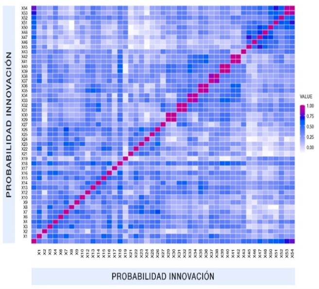 En la figura 2, se destacan con rectángulos de color oscuro las variables de innovación que influyen de manera más significativa en los procesos de producción de café especial para las fincas colombianas que participaron en el estudio, estas variables corresponden a: 1) Trazabilidad de la calidad del producto (X4); 2) Aplicación de pesticidas (X13); 3) Identificación y gestión integral de residuos (X18); 4) Conocimiento en primeros auxilios (X43); 5) Adopción de tecnología digital (X47); 6) Administración del recurso humano (X50); 7) Flexibilidad ante el cambio (X51); 8) Apalancamiento del recurso (X52); 9) Gestión de procesos (X53) y; 10)Inspección interna y autoevaluación (X54).